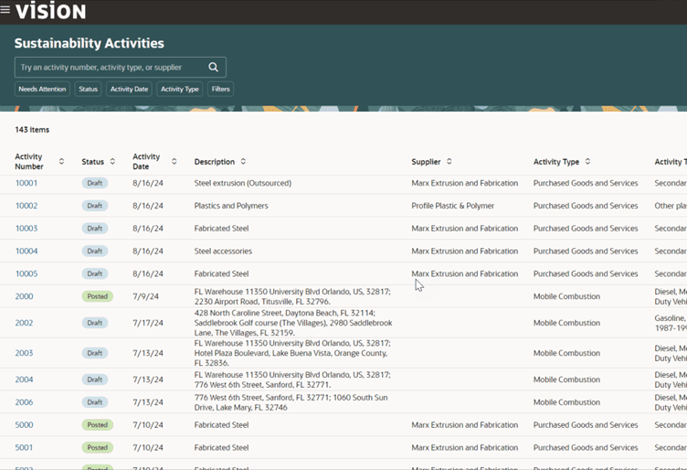 Activity types (e.g., Mobile Combustion, Purchased Energy, Business Travel)